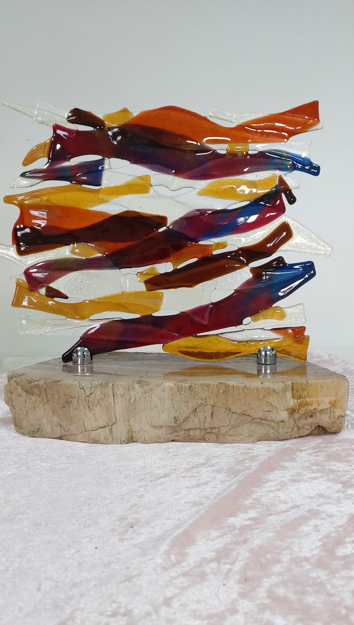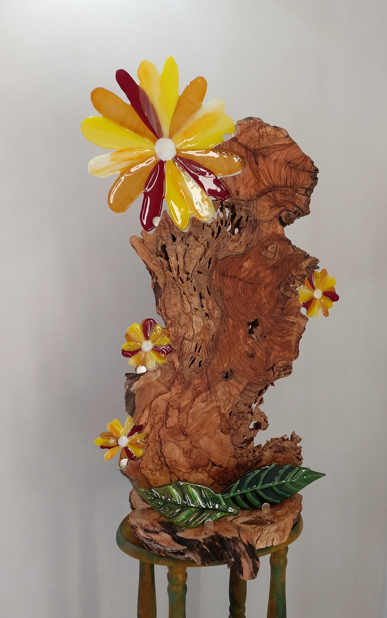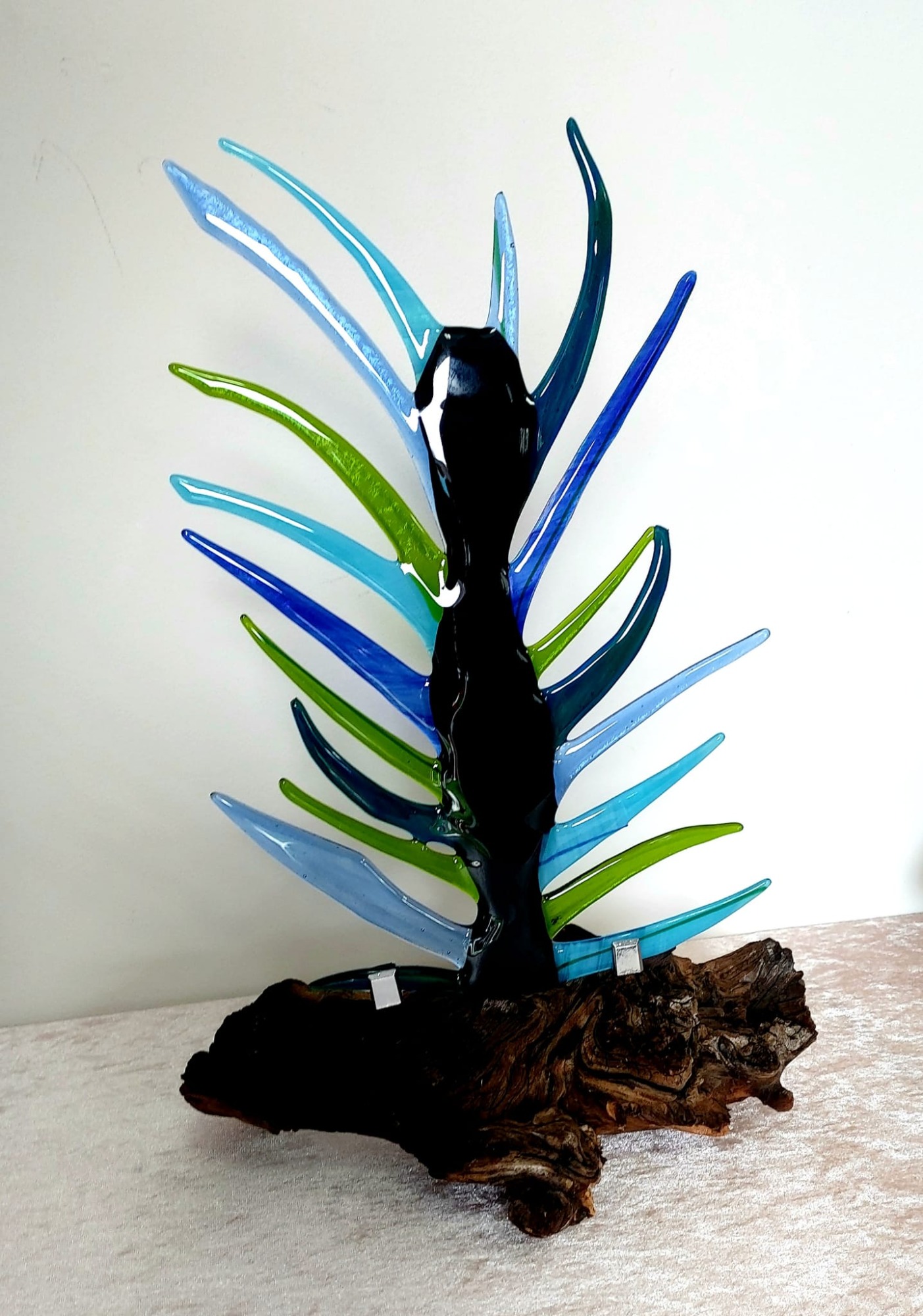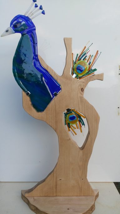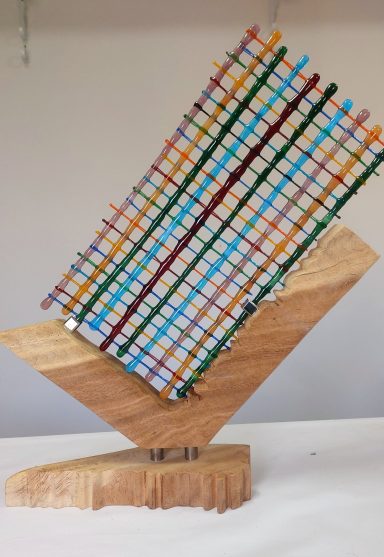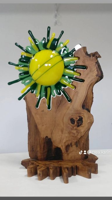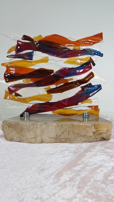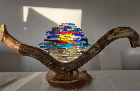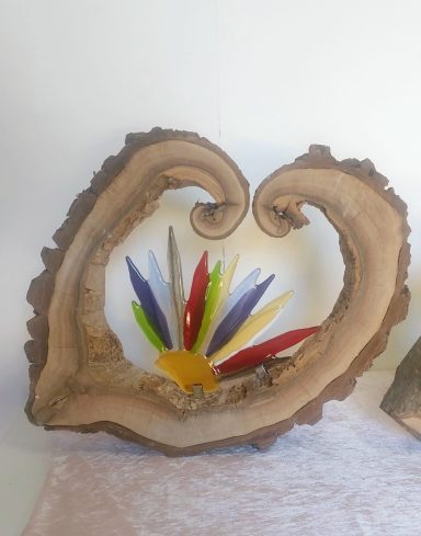 mijn glaskunst combineer ik met hout of versteend hout.