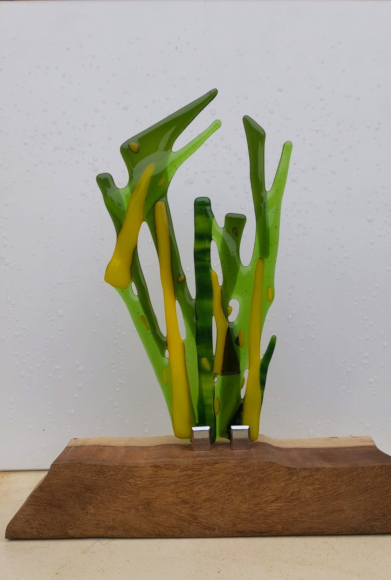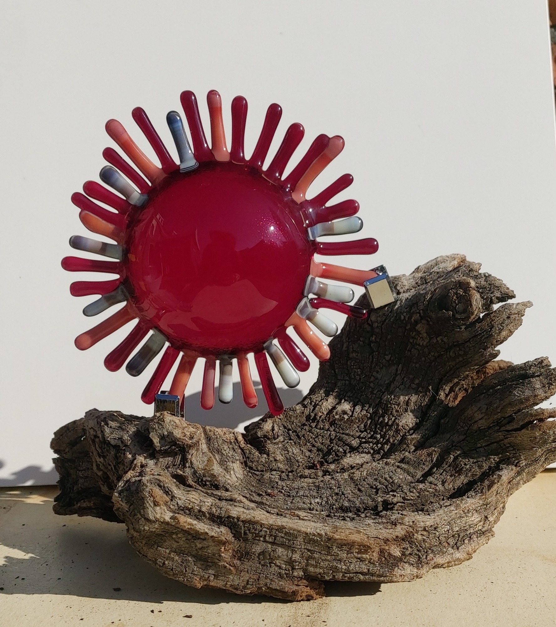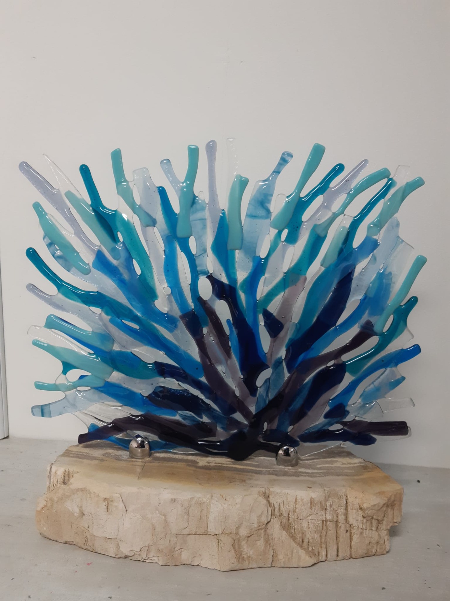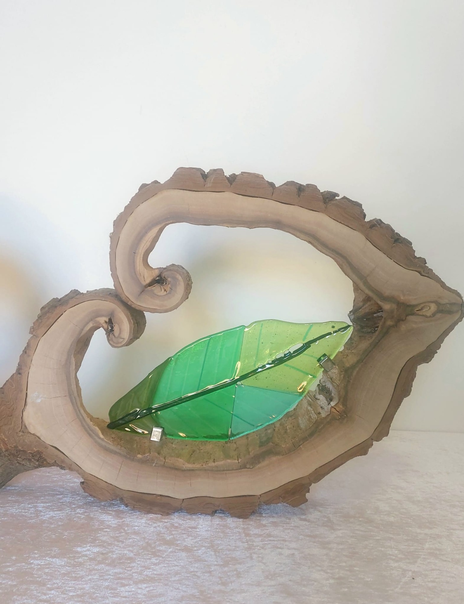 mijn glaskunst combineer ik met hout of versteend hout.