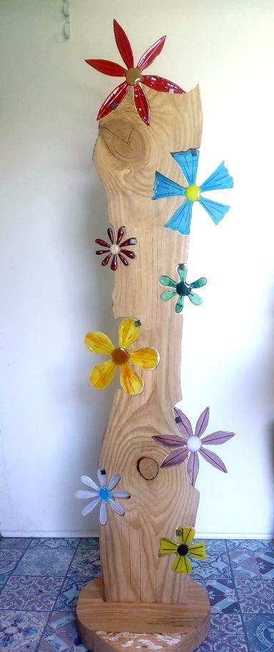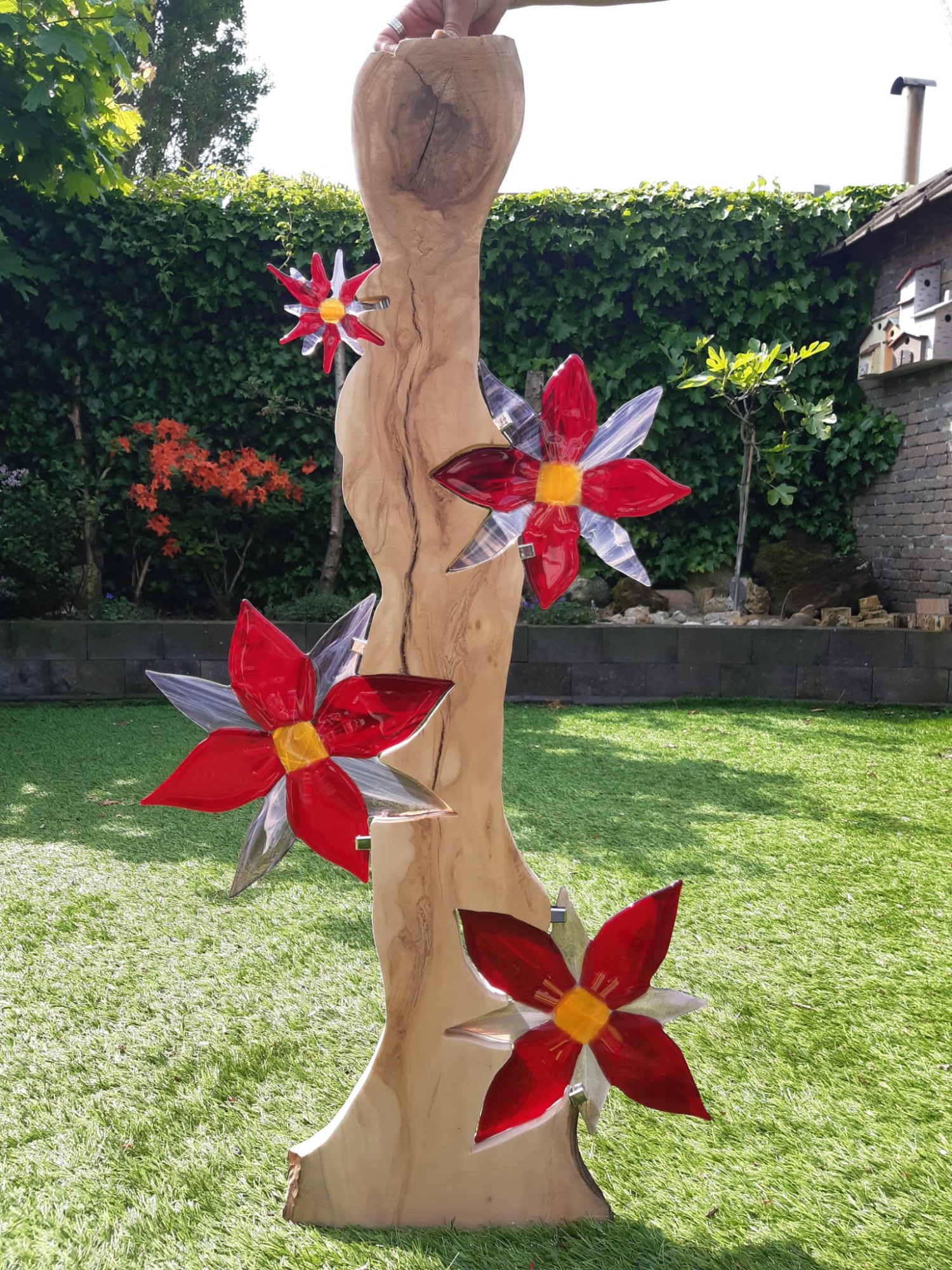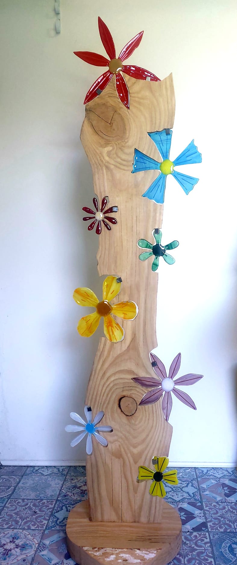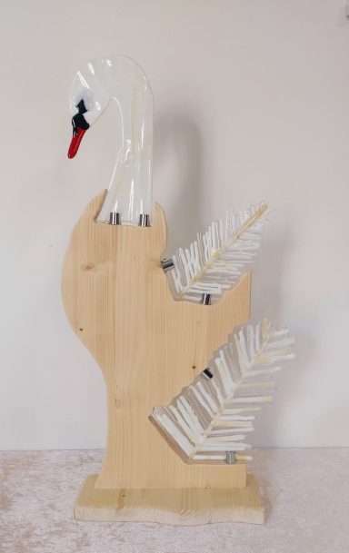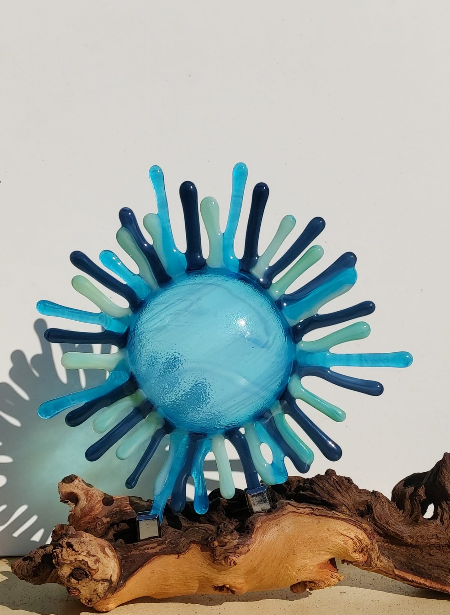 mijn glaskunst combineer ik met hout of versteend hout.